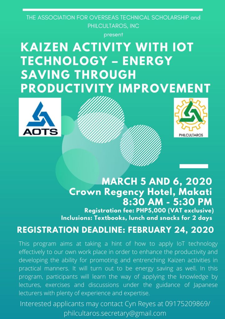 This program aims at taking a hint of how to apply IoT technology effectively to our own work place in order to enhance the productivity and developing the ability for promoting and entrenching Kaizen activities in practical manners. It will turn out to be energy saving as well. In this program, participants will learn the way of applying the knowledge by lectures, exercises and discussions under the guidance of Japanese lecturers with plenty of experience and expertise.