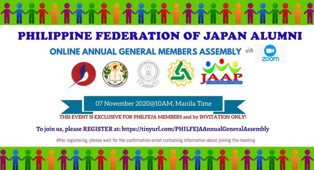 Two weeks from now, we will be having a Philippine Federation of Japan Alumni (PHILFEJA) Online Annual General Members Assembly via Zoom. On behalf of the Board of Trustees, i would like to invite you to be part of the said event.