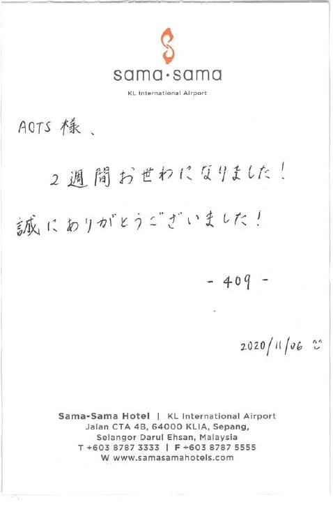 Hello friends!Recently the government of Japan has gradually allowing the foreigners to enter Japan. AOTS also expects that our trainees will come to our Centers in the very near future. Furthermore we have been requested to accommodate foreigners who are under the 14 days’ self-quarantine after arriving in Japan. As the first budge of this, 156 Malaysian students stayed at TKC from 22nd October till 6th November, which was a request by the Embassy of Malaysia in Japan. On 5th November, the Embassy of Malaysia organized an orientation session for the students who will study at different universities in Japan, and on 6th Nov, all of them safely completed their self-quarantine then left TKC. One of the students left a lovely memo to show her appreciation to AOTS. We are deeply impressed by her warm heart and sophisticated manner.This time, we closely worked with the Embassy of Malaysia. We are happy to work with their excellent team and would like to appreciate their dedicated work.AOTS wishes the success and health of all the students!TKC office