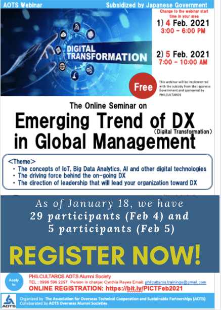 Registration for the Emerging Trend of Digital Transformation (DX) in Global Management Webinar is now CLOSED!We have a total of 29 participants for February 4 and 5 participants for February 5. Please make sure to check your e-mail address and/or viber for further announcements. Thank you!