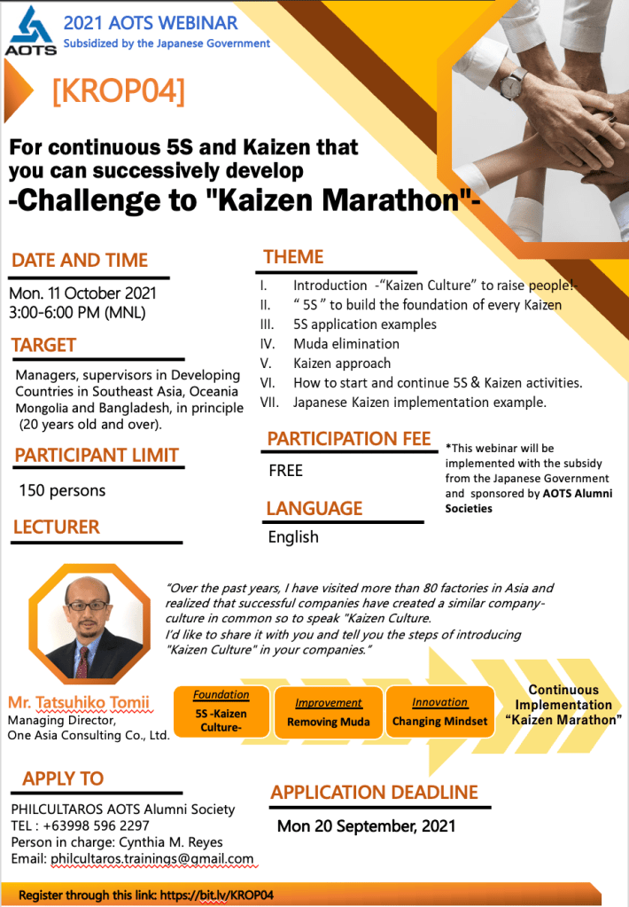 We are happy to inform everyone that a large number of participants registered for the webinar: For continuous 5S and Kaizen that you can successively develop – Challenge to “Kaizen Marathon” –