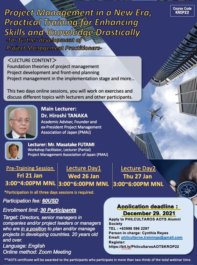 Main Lecturer: Dr. Hiroshi TANAKAAcademic Adviser, Founder and ex-President Project Management Association of Japan (PMAJ)